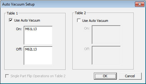 This will enable the switch for table vacuum to be on when cutting and off when loading/unloading. Enter the appropriate cnc code to enable/disable the output(s) for the vacuum switch(s) and check Use Auto Vacuum to enable. This feature is only useful if the machine is equipped with an auto vacuum switch.
