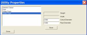 Available utilities include a Generic Cutout which is rectangular, a Vent, Water Pipe and Water Drain, which are all circular.