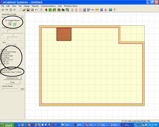 Another way of locating cabinets at the ends of the walls is to simply place them on the wall but away from the end. Then, switch to the Select Move Mode, highlight the cabinet, set the distance on that side to zero and press Enter. The cabinet will move to the end.